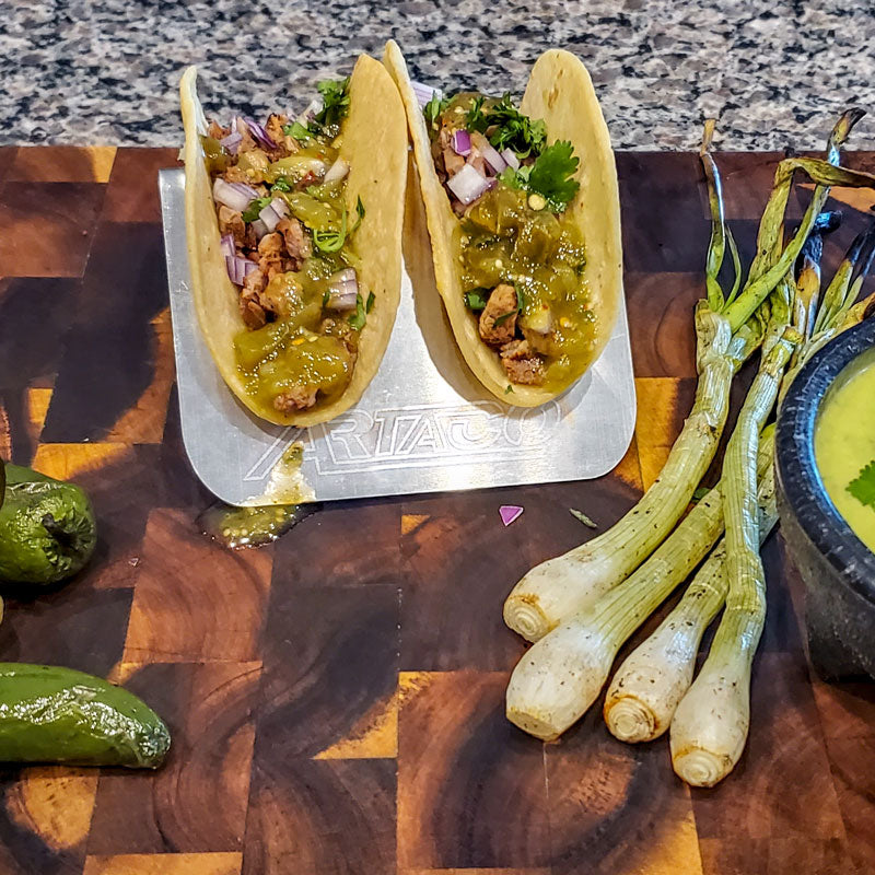 Food grade 16 gauge aluminum. Lightweight and easy to store in the corner of a cabinet. Oven safe, Not dishwasher safe. Great for hard or soft tacos. Perfect for a plate with tacos and beans and rice.
