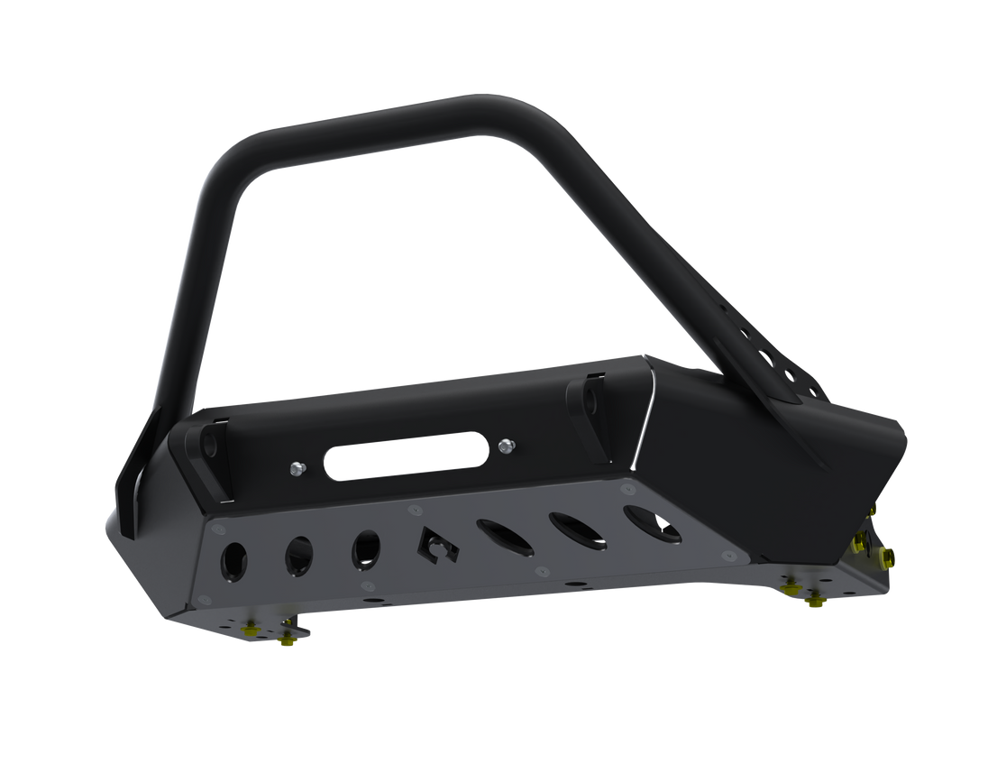 Artec Industries' Bantam Series Front Bumper with Hoop: USA-crafted from CNC laser-cut steel. Features amplified clearance, reinforced winch mount, aerospace-grade skid, and a robust hoop. Choose bare steel or matte black powder coat.