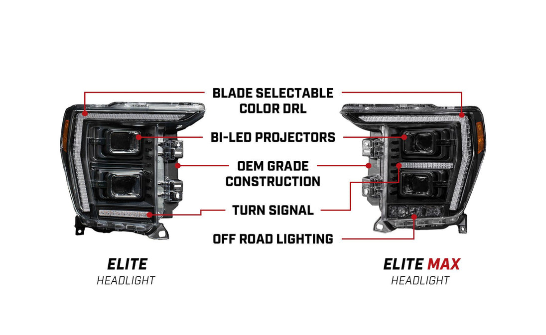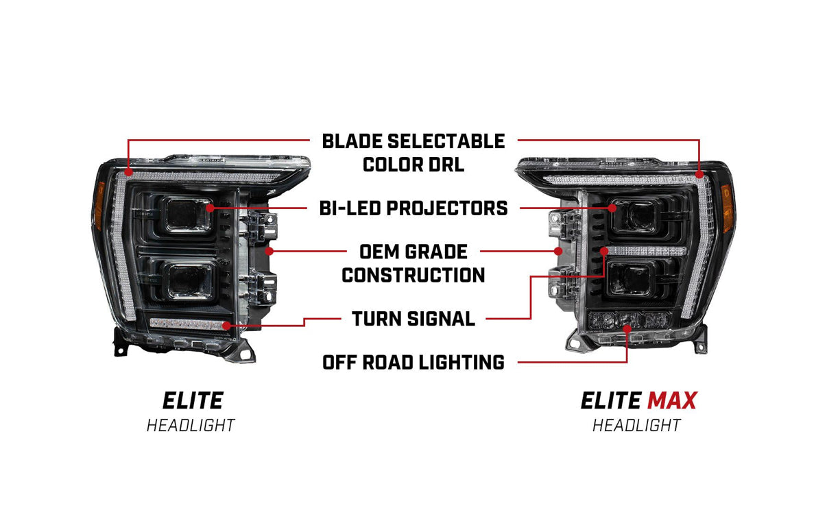With OEM-grade quality the Elite Series headlights will add a sequential turn signal welcome sequence a brighter blade DRL with selectable color and optional offroad lighting and show mode. Plus you'll get upgraded headlight performance and output backed by an 8-year warranty.
