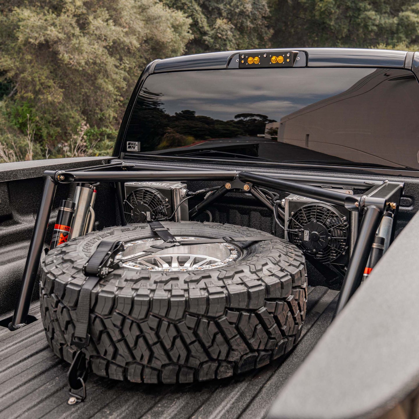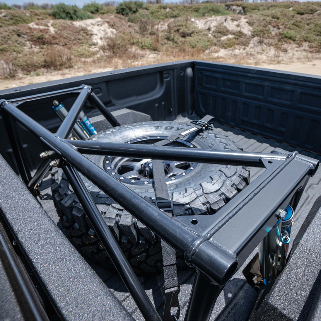 The Dirt King Prefab Bed Cage was developed after building numerous custom bed cages. With that experience we've perfected the design for maximum travel and easy installation. The bed cage takes up minimal bed space while not compromising strength. Accessory mounting holes are incorporated into the center section of the cage to mount dust lights and flag whips. The entire kit bolts together and mounts to the frame after four brackets are welded on. It can be installed with leaf over or leaf under spring packs. This suspension system is superior to a cantilever suspension system for two major reasons. The first reason is the shock mounts on the bed cage are outside the frame rails vs inside the frame rails for increased stability. The second reason is the shocks are mounted vertically with a motion ratio close to 1:1 allowing for proper dampening through the suspension travel. The cantilever suspension has a higher motion ratio resulting in smaller shocks, difficult to valve shocks properly, and heating up the shocks faster since they have less fluid. The Dirt King Prefab Bed Cage is your best choice to increase rear suspension performance while not breaking the bank.