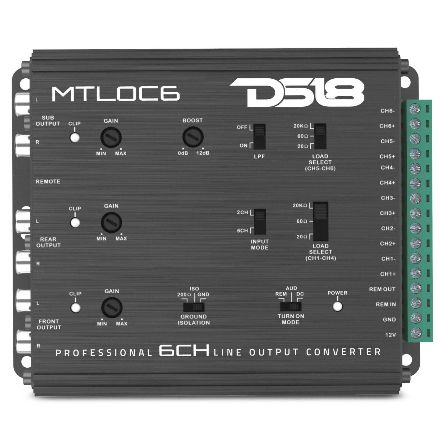 DS18’s MTLOC6 converts up to six factory speaker outputs to six RCA low-level signals. Selectable impedance settings and input modes make it compatible with various factory stereo configurations.