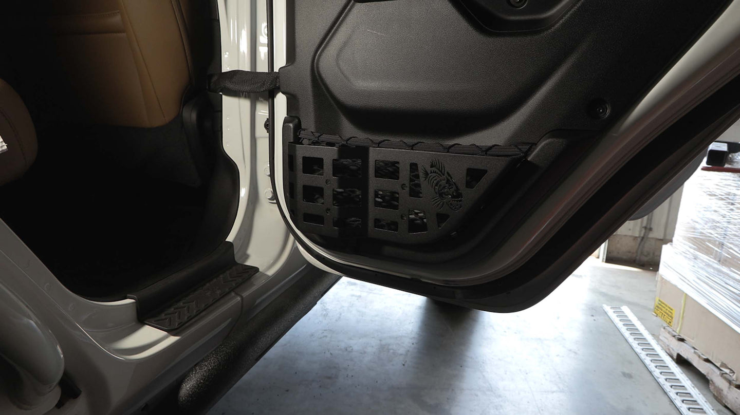 Installation is a breeze—no need to remove the door panel. The snap-in design with locking tabs ensures a secure fit while allowing for easy removal if needed. These MOLLE panels seamlessly complement your Jeep’s interior with their sleek, functional design and durable textured black powder coat finish. Plus, unlike the competition, you can keep the factory netting if preferred.