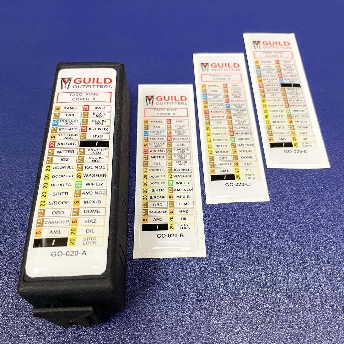 This fits all 2016+ Toyota Tacomas and the cover clears all "add-a-tap" fuse holders and features 4 knockout channels on the exterior side lined up to the most commonly tapped fuses and 1 on the interior side so you can choose where you want your wire exiting. Our color coded Fuse label closely matches fuse colors. Each of our covers comes with four stickers, identify the one that matches your factory fuse cover and apply based on model.