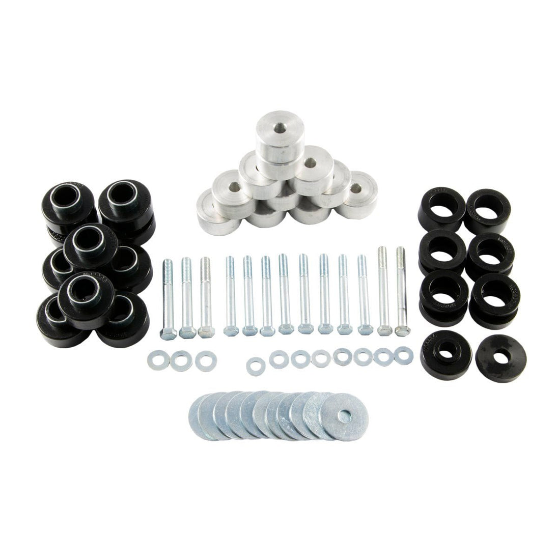 Our body lift "Pucks" are made out of 6061-T6 aluminum. We're talking about aircraft quality stuff here! They will not crush, break or slip around once bolted in place. Natural aluminum color looks great under your rig, and there's no plastic to break or look "cheap."