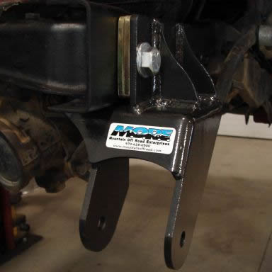 All M.O.R.E. Jeep S.R.S. have a very important design feature built into the new front pivot brackets. They move the front axle forward from the stock location. Why? When the shackle is reversed to behind the front axle, it will swing rearward and the tire will move slightly aft as the suspension compresses. Pushing the wheelbase forward will help keep the tire from contacting the fender during suspension compression. This is the only correct way to build a reversal system. Due to the action of this suspension movement, the front drive shaft needs to have more slip-yoke travel than stock (almost double!). With this in mind, the front drive shaft will have to have a longer travel slip-yoke installed by a professional drive line builder. Also, a stock pitman arm may need to be retained (no drop) but will vary depending on the amount of lift you have on your Jeep®.