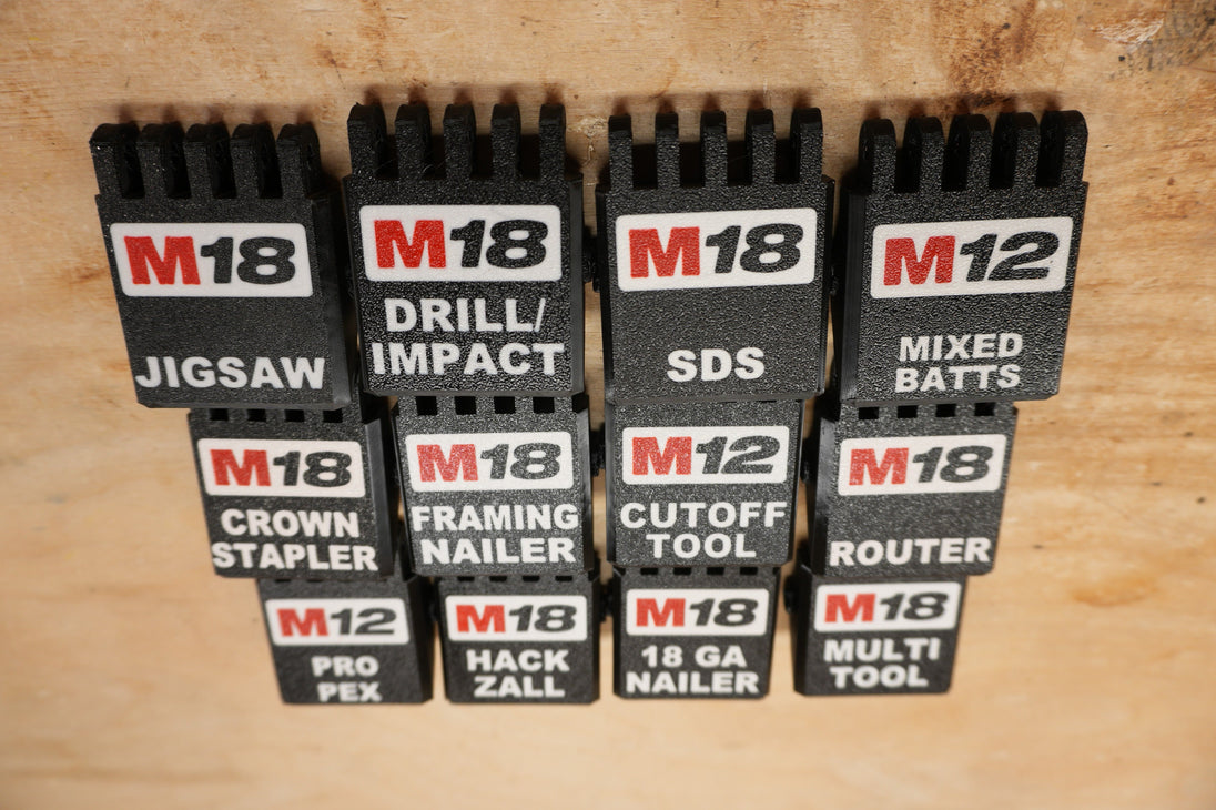Latches print in black with white text and Milwaukee "M", M12, or M18 logos. Many of the pictures below are for latches for other boxes, but these print in the same style.