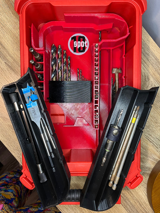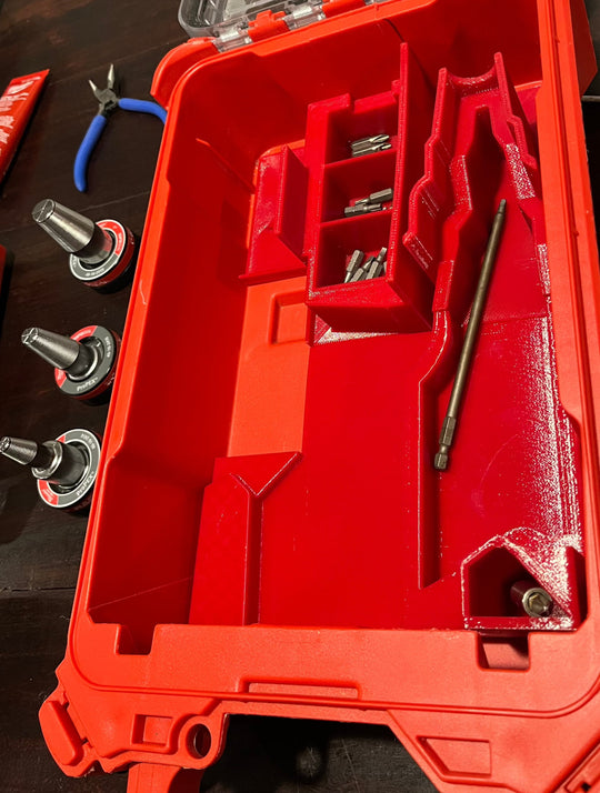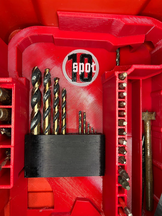 This insert was designed to hold the Milwaukee 2904 M18 Hammer Drill/Driver. It can also hold a battery up to 6.0, and has several spots for bit organizing, including: -12 spots for individual 2” power bits...Regular price From $50.00Regular price From $50.00 -