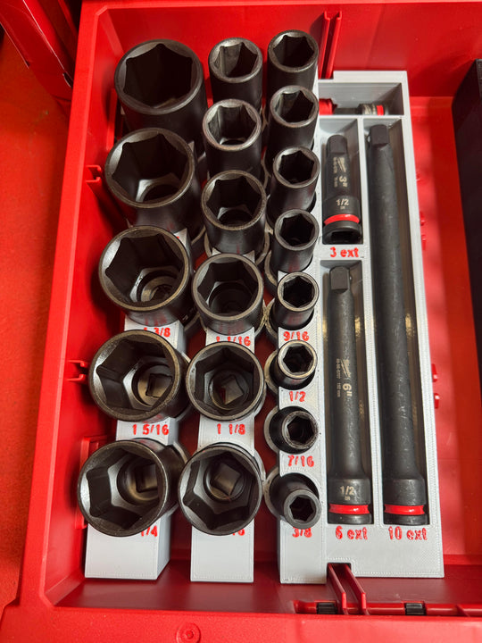 This insert is designed to hold: Milwaukee 43-Piece Impact Socket Set 49-66-7009 It has extra spaces large enough to hold: 1-2 small sockets or extensions 6-8 extra sockets Socket Wrench It fills up 1/3 of a...Regular price $50.00Regular price $50.00 -
