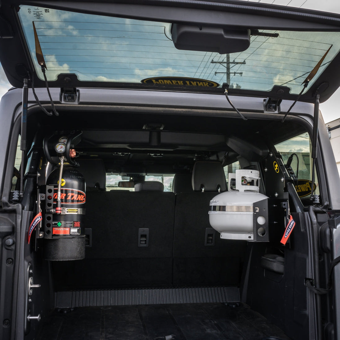 The 4 Door Bronco Plate bolts on to the roll bar of your 4 door Bronco using simple hand tools in less than 20 minutes with no wiring to connect or air hoses to plumb. The Bronco Plate has been designed to mount 5 lb, 10 lb, and 15 lb Power Tanks as well as 5 lb and 11 lb steel propane tanks and 6 lb and 10 lb aluminum propane tanks and their brackets. In addition, there is a spot to mount a quick-release fire extinguisher bracket and there are expansion slots for future products and accessories.