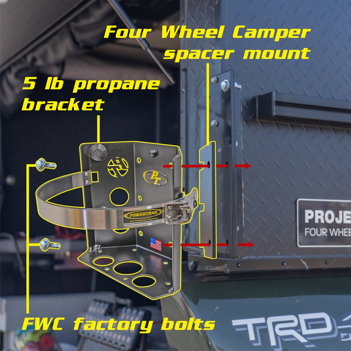 The Four Wheel Camper Spacer Mount gives you a quick exterior mount for a 5 lb Power Tank Super Bracket or a 5 lb Propane Tank Bracket. The spacer pushes the bracket away from the smaller exposed bolt heads and re-uses the 3/8 bolts included with the camper's corner jack mounts.