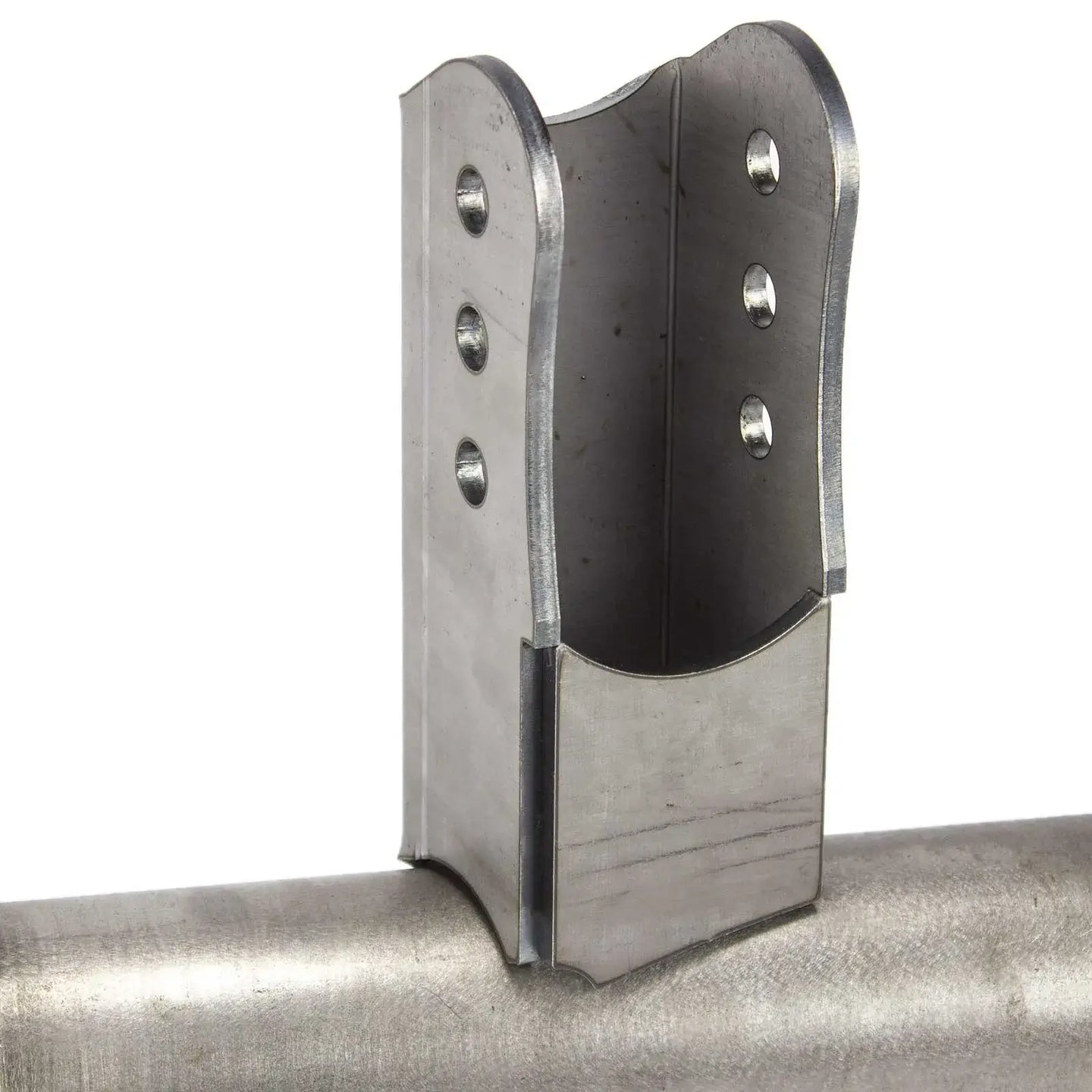 The Adjustable Axle Mount Link Tower is engineered for passenger-side front axle applications in 3- or 4-link suspension systems. Crafted from 1/4" A36 plate steel, it mounts over the axle tube center for maximum weld contact. The bent-leg design (set at 10°) improves clearance, while three 9/16" holes spaced 1" apart allow you to fine-tune link separation and squat characteristics. The keyed boxing plate ensures straightforward setup and fully boxes the bracket for unmatched strength. Designed with a 2 5/8" inside mounting width. Sold individually.