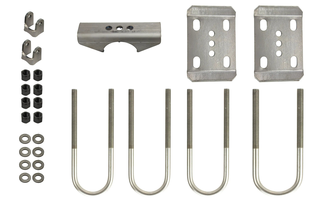 This axle swap kit is built for Dana 44 front axles running 2.5" wide leaf springs. It’s available for either 2.75" or 3" axle tubes—check your axle before ordering. Most 5- and 6-lug Dana 44s use 2.75" tubes, while most 8-lug axles use 3". Includes spring plates, perches, U-bolts, and weld-on shock brackets sized for 1.5" ID bushings.