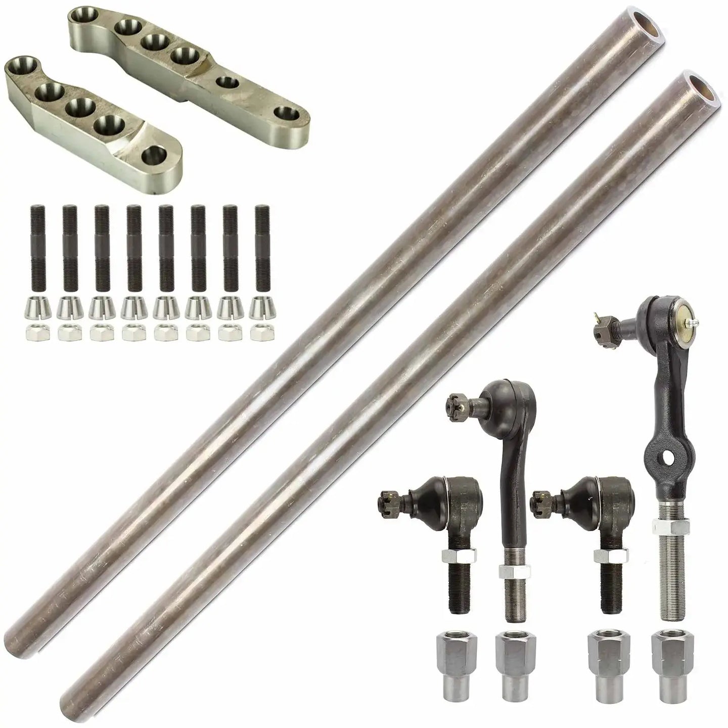 Built using 1.5" x .25" DOM tubing and GM 1-ton tie rod ends. Hex head bungs make adjustments easy with a crescent wrench. High steer arms are machined with proper Ackerman angle and include dual holes for hydraulic assist options. Compatible with Reid knuckles or stock knuckles (just ignore the 4th hole if unused).