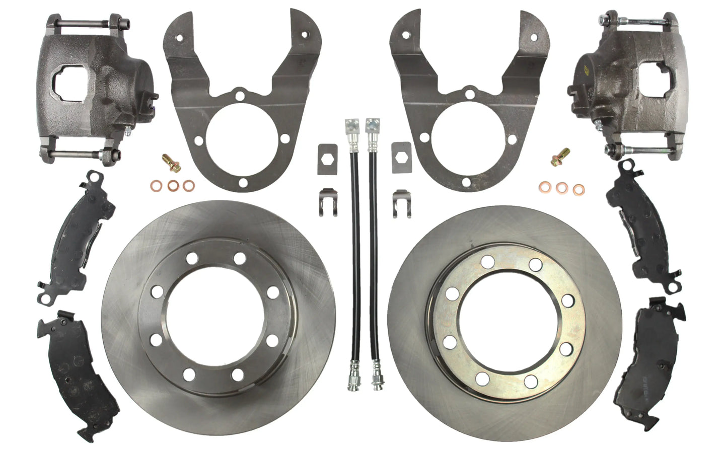 The kit replaces the factory drum brakes with a rotor and caliper setup that sheds over 100 lbs. It mounts the rotor behind the hub and uses standard, non-parking brake calipers. Not intended for towing or use with dually wheels.
