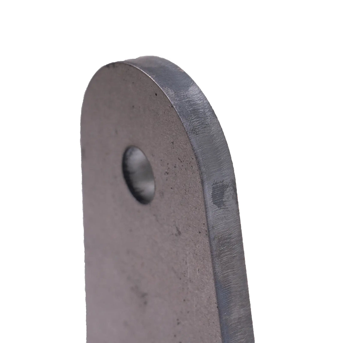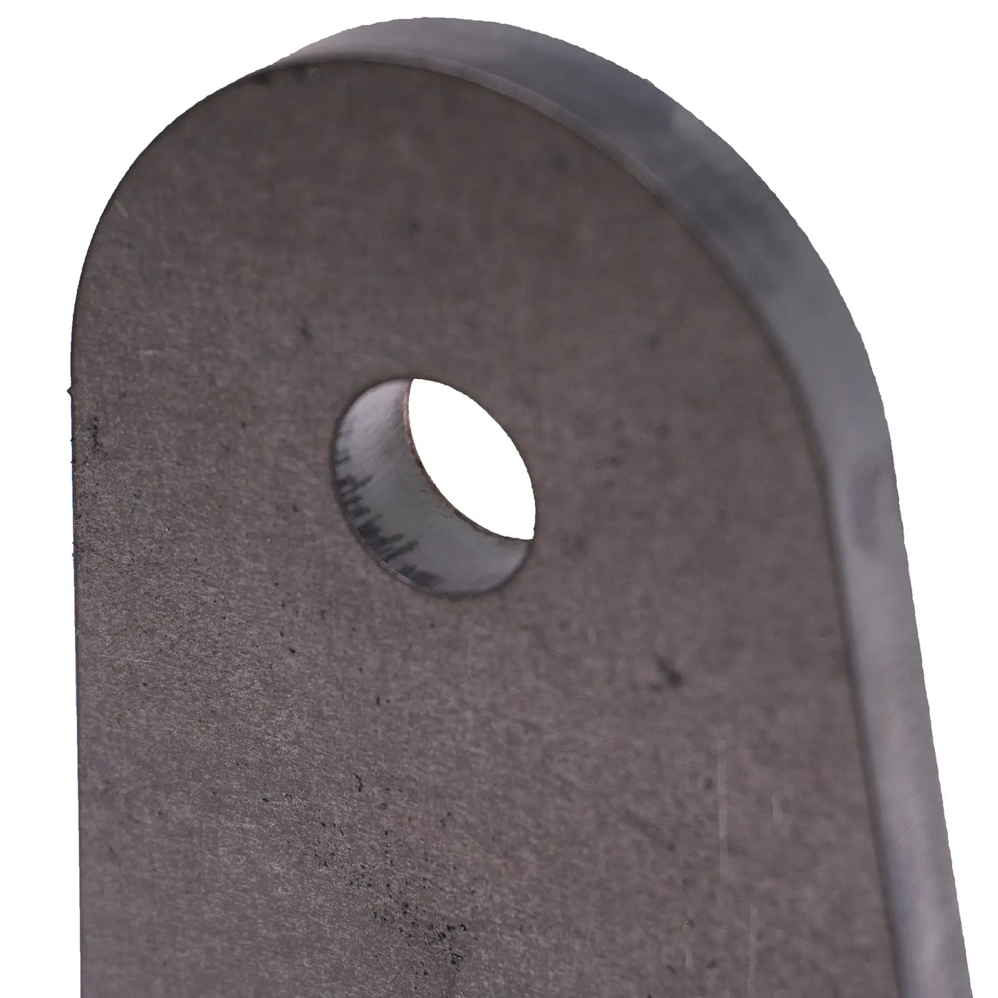 This flat long link tab mounts to trusses, frames, or any flat surface where a straight weld pad is available. It is .375" (3/8") thick to match the strength of paired 1/4" link brackets. The geometry places the bolt centerline 3.125" from the mounting face for added reach and packaging flexibility.