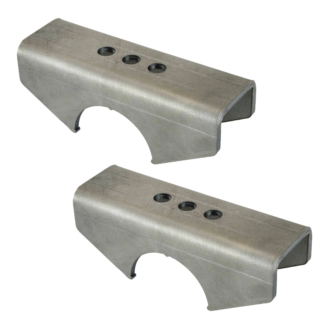 These perches are CNC laser cut from .25" HR P&O steel and brake-formed for consistent fit. The 7.75" length helps control axle wrap, and the 2.5" width provides a stable spring platform. Three spring pin holes allow small wheelbase adjustments without re-drilling your springs.