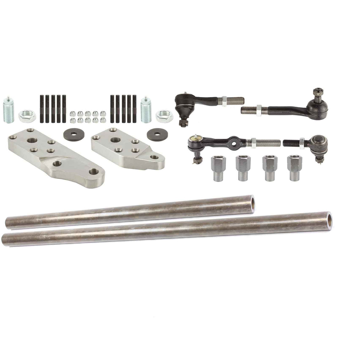 Included are two high steer arms machined from cold-rolled 1018 bar—each with dual holes for use with hydraulic or hydraulic-assist steering. They're also drilled for Reid Racing knuckles (just ignore the last hole if not needed). You get heavy-duty 1.5" x .25" wall DOM tubing, four beefy GM 1-ton TREs (including the Y-link specific ES2233L and a high-angle ES2027R), and our hex head bungs and jam nuts for simple, tool-friendly adjustment. Built for strength and made to fit.