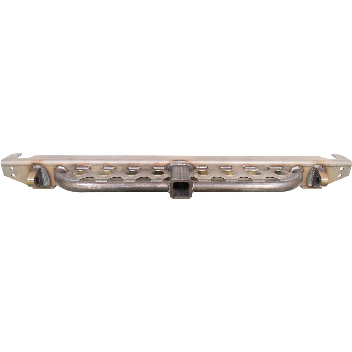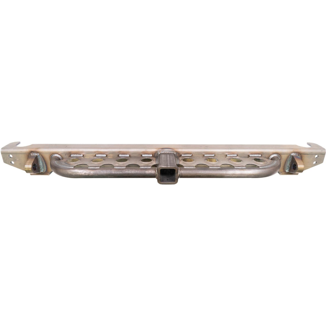 This loaded rear overlay bumper transforms your Jeep's rear end with everything needed for serious off-road adventures. The overlay design bolts over your existing bumper structure for added strength while incorporating a receiver hitch, dimple die step plate, and D-ring recovery points all in one comprehensive package.