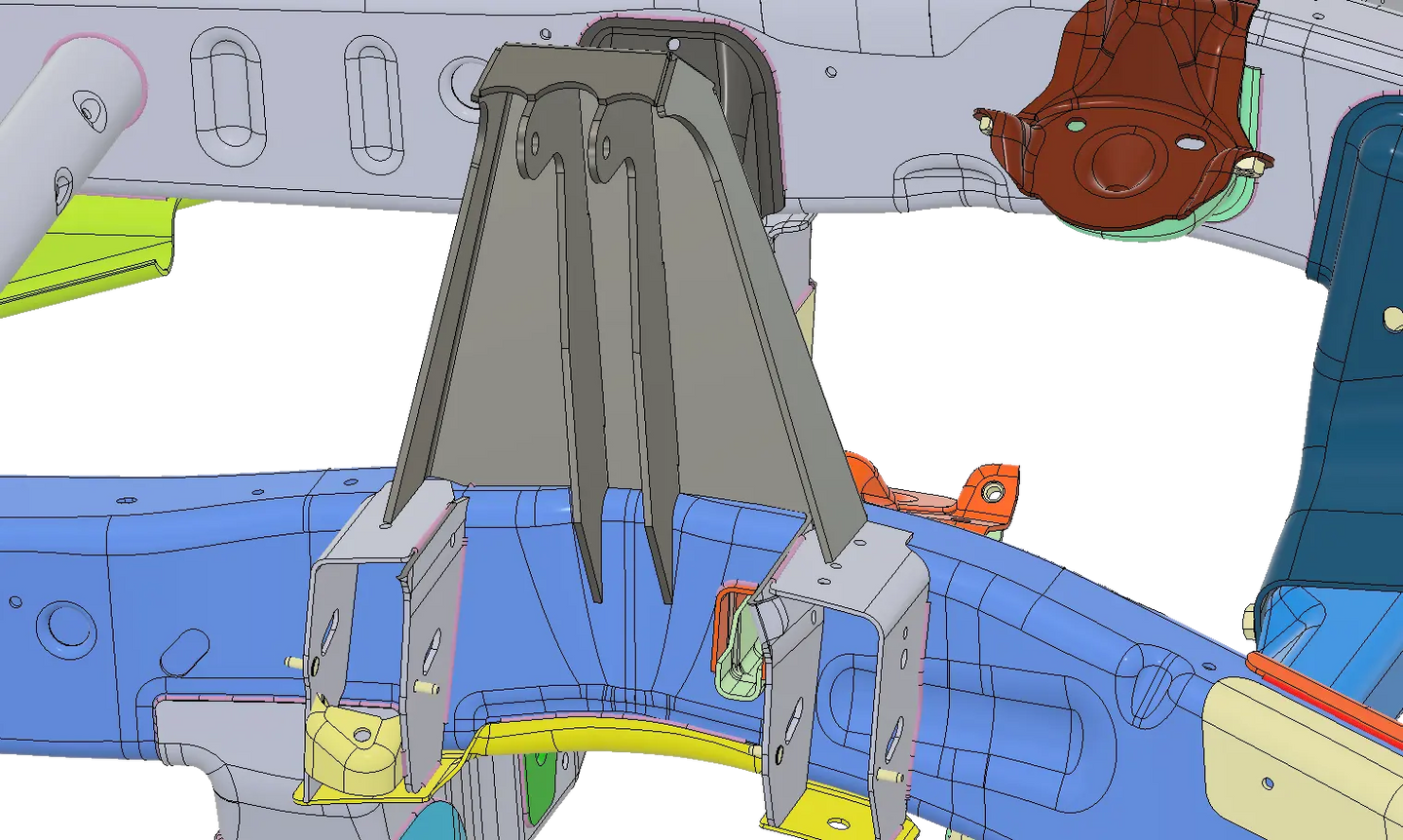 Welds onto the frame tabbing off the upper control arm mounts.