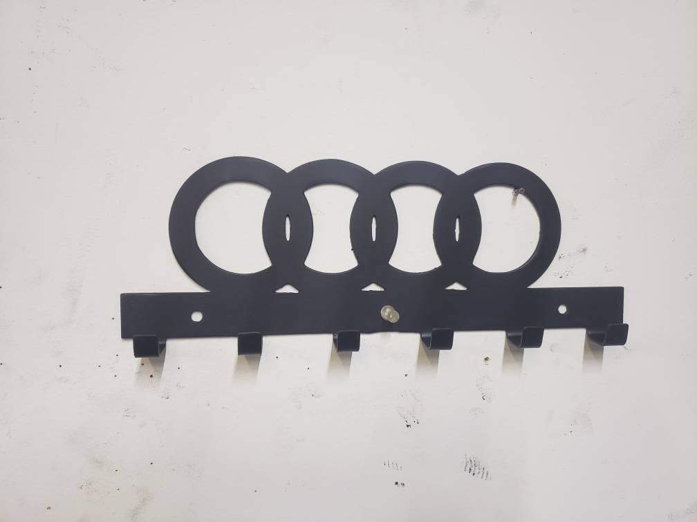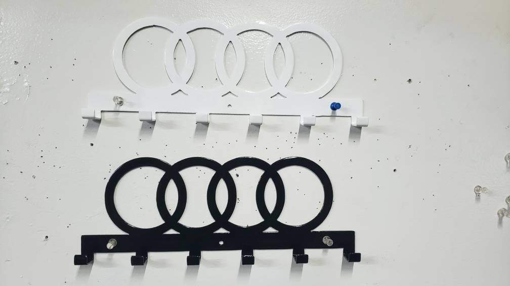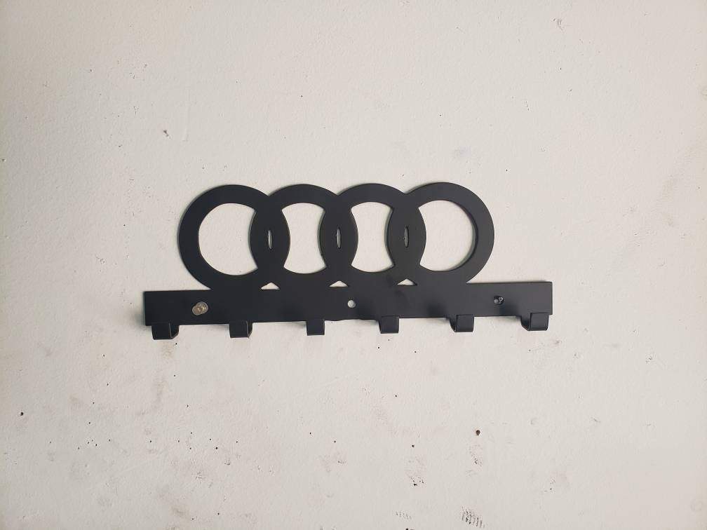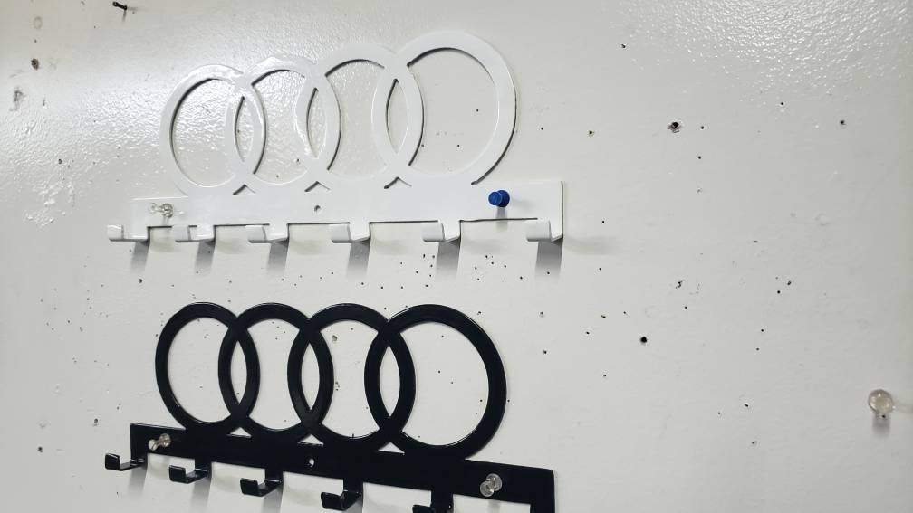 Celebrate Audi style with this steel keychain rack featuring the iconic four-ring logo! This wall-mounted organizer is a perfect gift for Euro car fans and a sleek way to keep your keys organized.