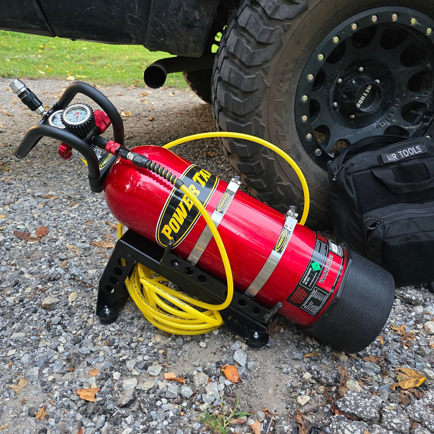 CO2 Tank Floor Bracket, with optional Super Bracket and base plate. If you use your Power Tank on-the-go at the job site or at the track one of the biggest worries is knocking your tank over. If you use a Speed Bag you can buckle the top strap around a pole or stud but if you must move it from place to place often this can get old fast. There's an easy solution called the Floor Bracket.