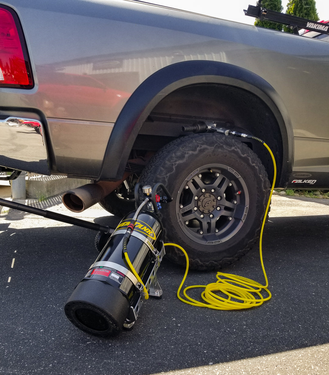 Another great application for the floor bracket is to mount a Power Tank low in the bed of a truck. Our base mount makes install in a truck bed or a tool box simple. With a locking, quick-release latch, the whole Power Tank and Floor Bracket can be taken out and moved around while the base mount stays put. Stainless steel hardware. For just the base mount, look for part number BKT-2310.