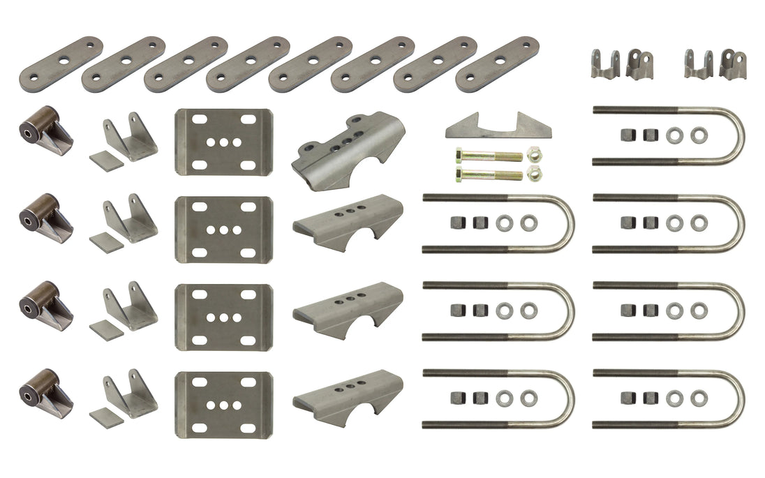 This kit provides the core hardware for an FJ40 spring-over-axle conversion using the stock axles. It includes perches, U-bolt plates, hangers, shackles, U-bolts, shock brackets, and hardware so you can assemble the suspension without sourcing individual pieces. Leaf springs are not included, allowing you to choose rates and lengths that fit your build, and the included degree plate (0° or 10°) lets you set caster and pinion to match steering and driveline targets.