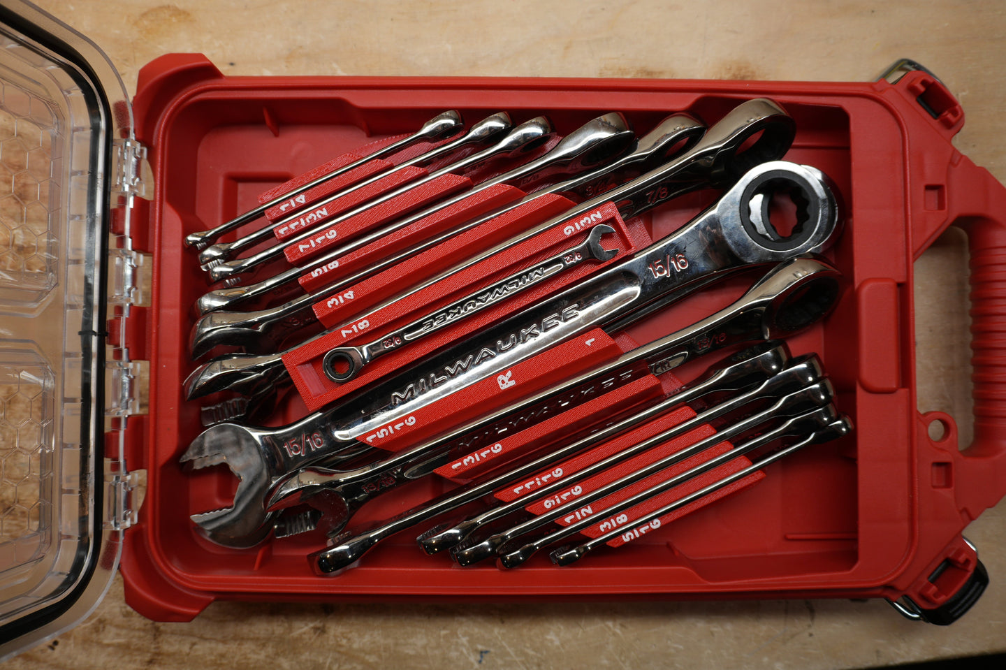 This insert was designed to hold the 15-piece ratcheting SAE combination wrench set 48-22-9416, but will hold any similar wrench sets. It fits in the low-profile 5-compartment packout organizer (48-22-8436).